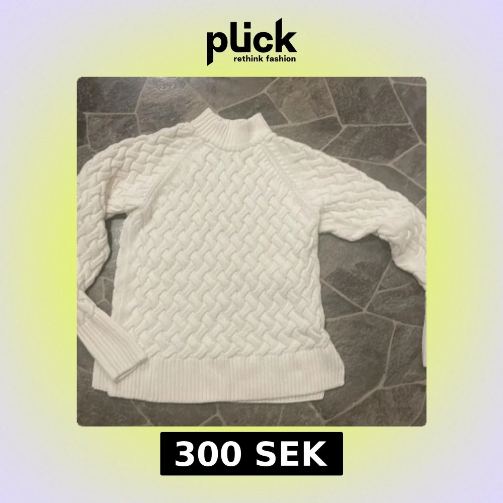Säljer en stilren vit stickad tröja med ett snyggt flätmönster. Tröjan har långa ärmar och ribbade muddar vid ärmslut och nederkant. Perfekt för kyliga dagar!