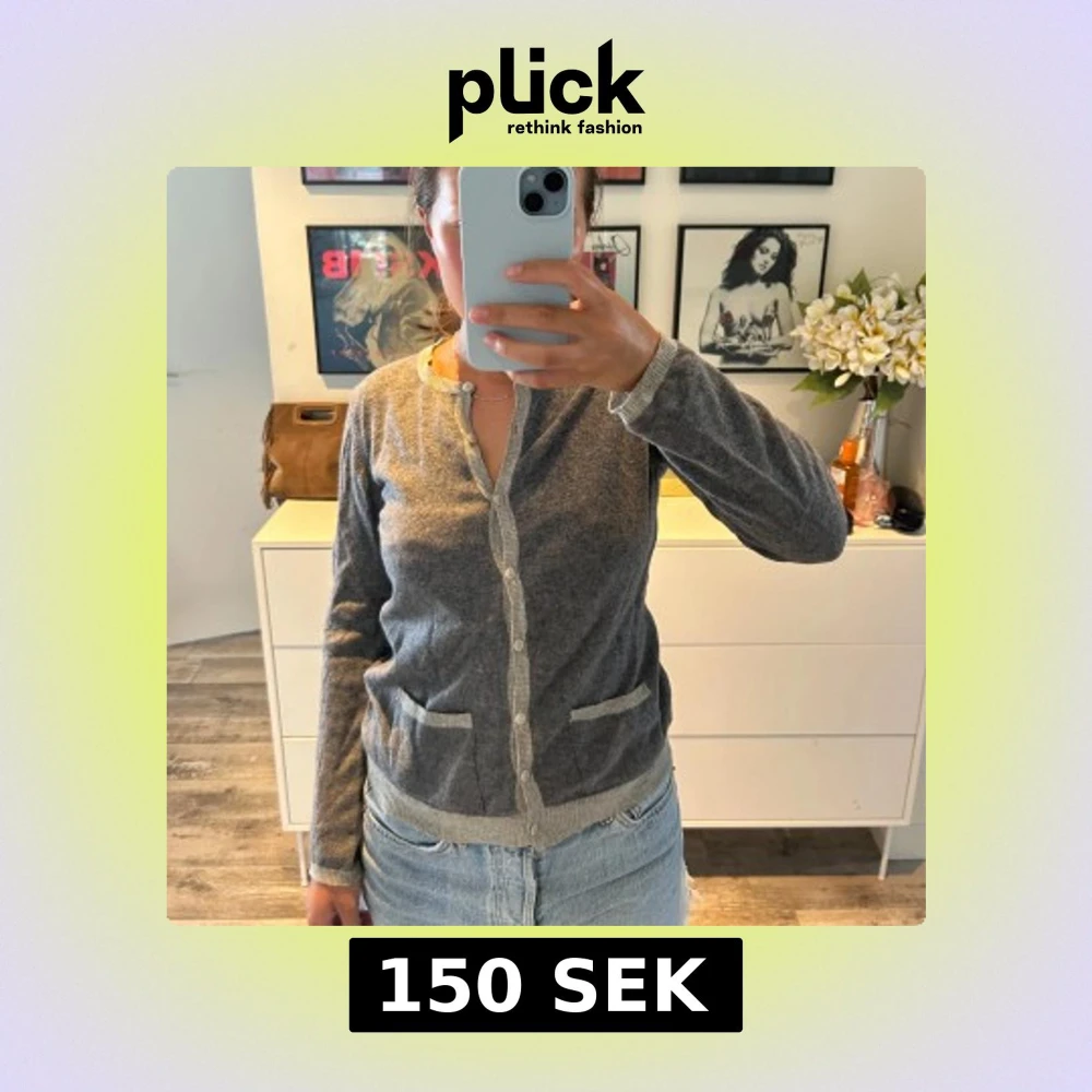 Mysig grå kofta med ljusare ribbade kanter, knäppning framtill och två små fickor. Kashmir liknande material, superskön!