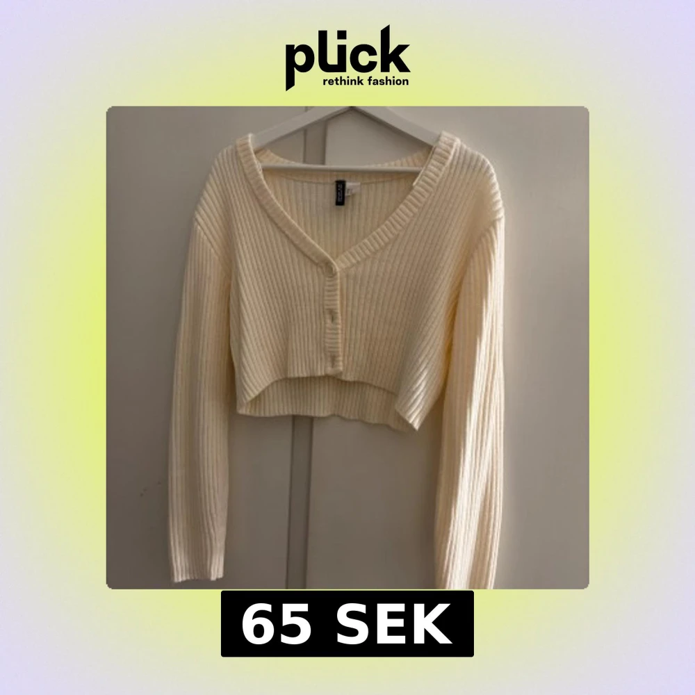Superfin croppad kofta i krämvit färg från H&M. Ribbstickad med v-ringning och knappar framtill. Långärmad och i mjukt material som passar att ha över exempelvis ett linne eller så som den är💘