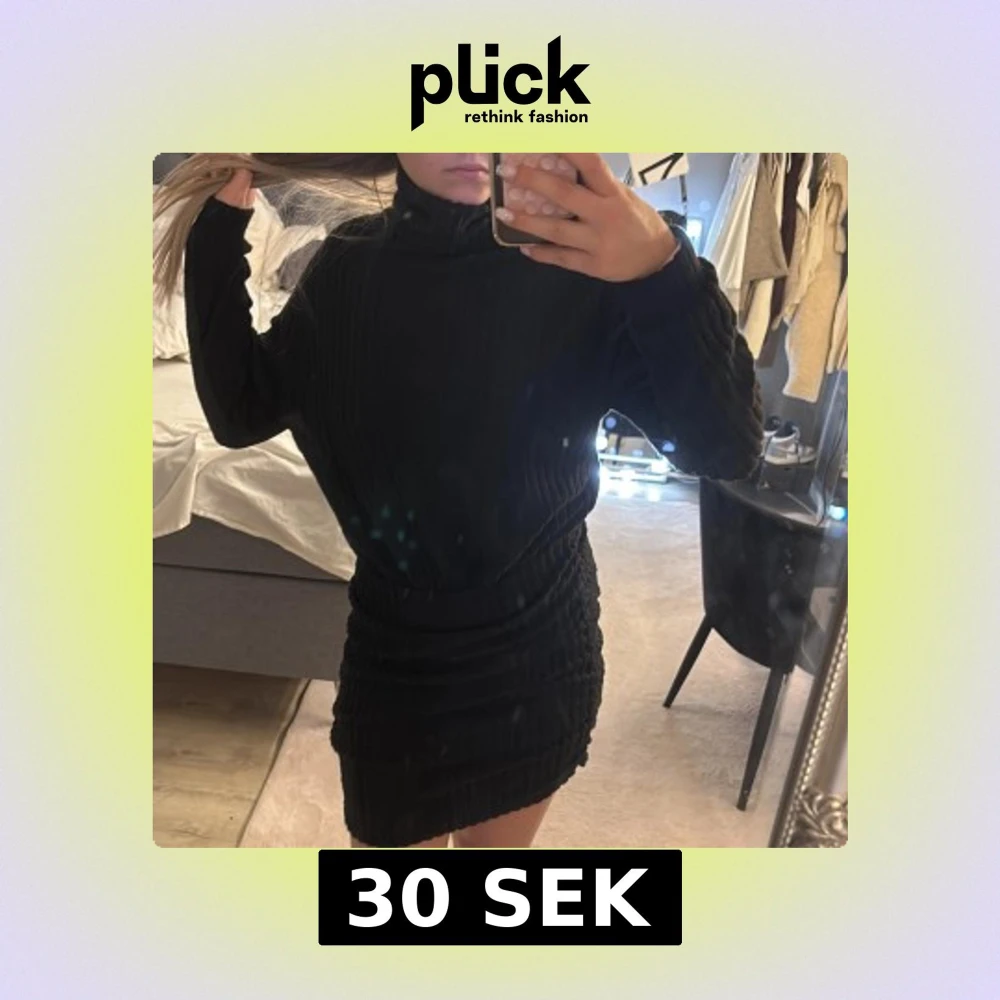 Säljer en svart ribbad kortklänning med polokrage och långa ärmar i mjukt gosigt material . Klänningen har en tight passform vilket gör den både snygg och bekväm. Står inte vart den är köpt
