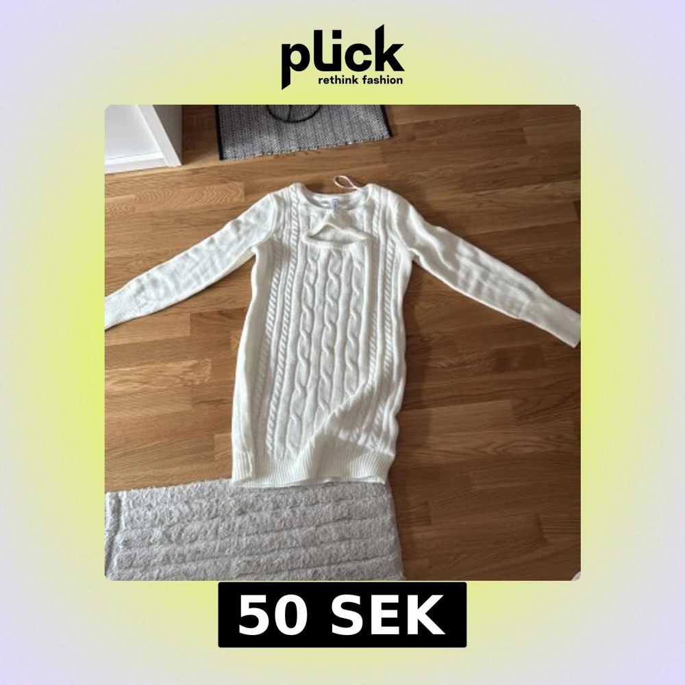 Säljer en stilren vit stickad tröjkläning från Rainbow med ett klassiskt flätmönster. Tröjaklänningen har långa ärmar och en rund halsringning, perfekt för kyligare dagar.🧶✨