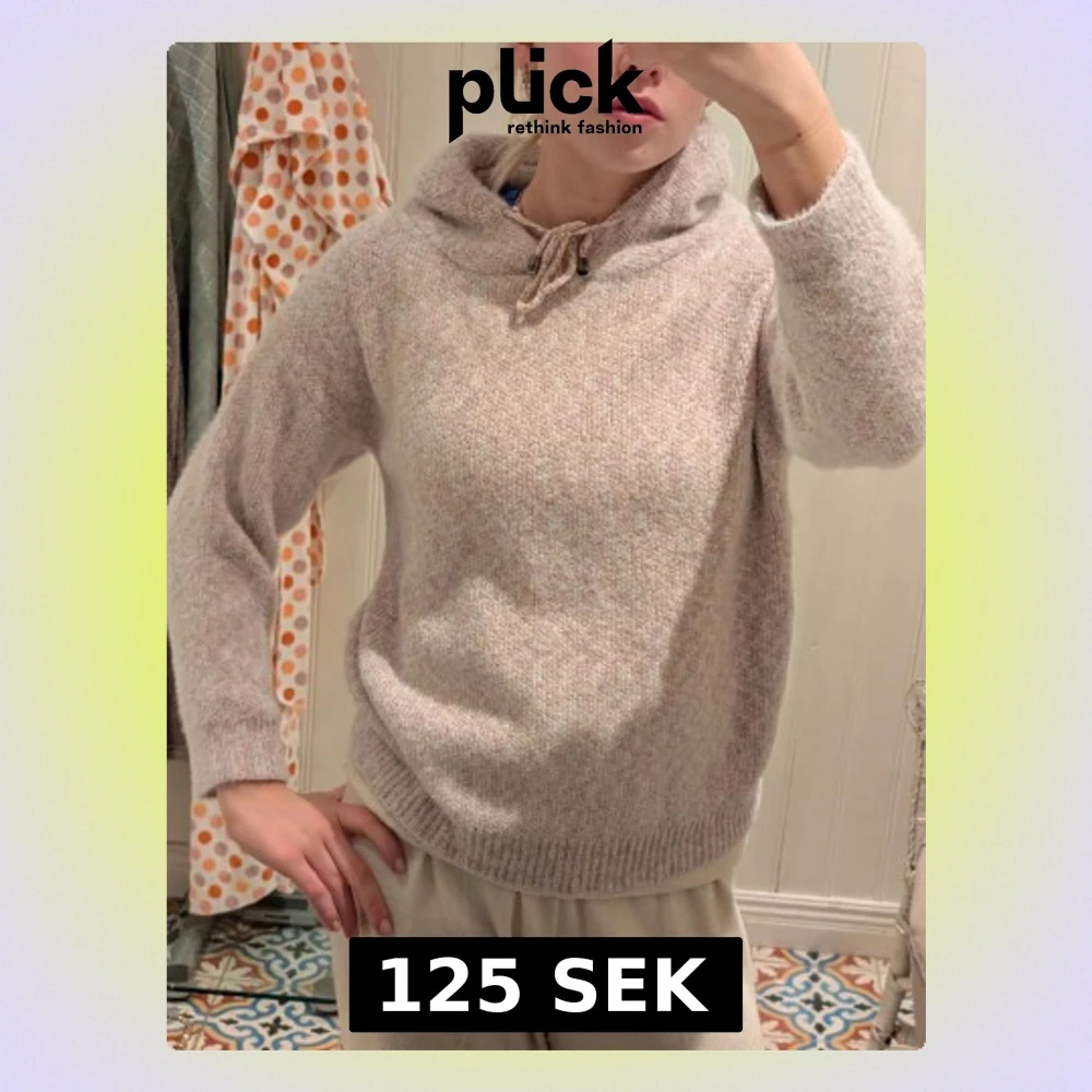 Mysig beige stickad hoodie med huva och snörning i halsen. Tröjan har en loose passform och långa ärmar, perfekt för att chilla eller hänga med kompisar. Materialet är mjukt och ger en skön känsla mot huden. Enkel och stilren design som funkar till många outfits.