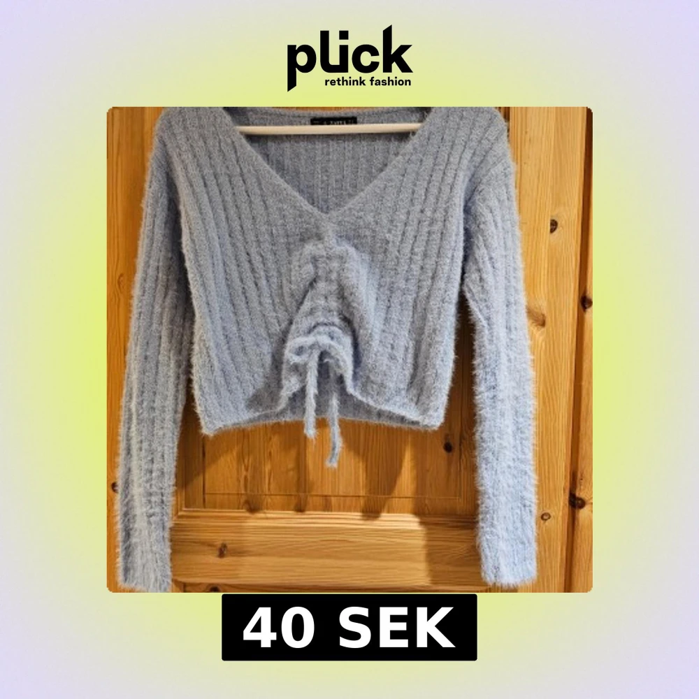 Mysig ljusblå tröja från Zaful med en fluffig textur och ribbad design. Tröjan har en v-ringad hals och knytning framtill som ger en snygg detalj.