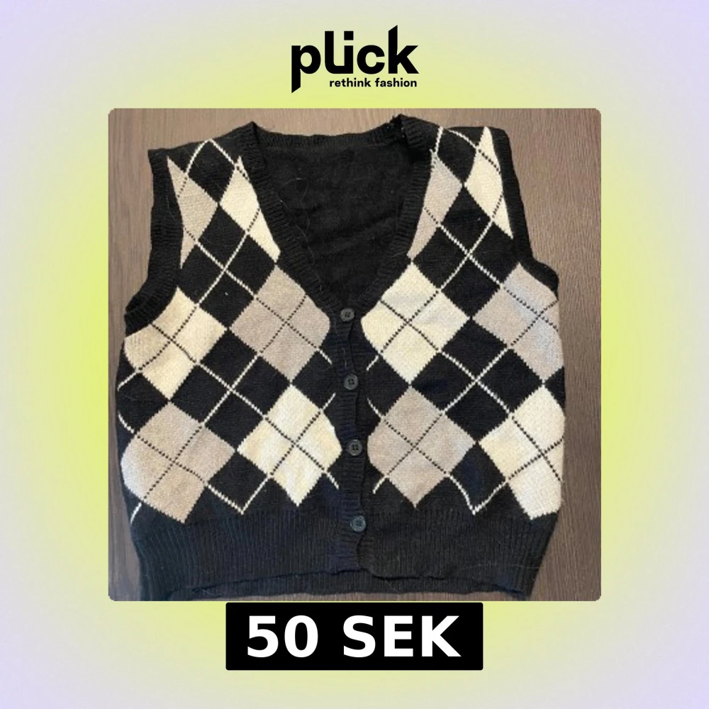 Stickad väst med klassiskt argylemönster i svart, beige och vitt. Västen har v-ringning och knäpps med fyra knappar framtill. Perfekt för lager-på-lager och ger en preppy vibe till din outfit.