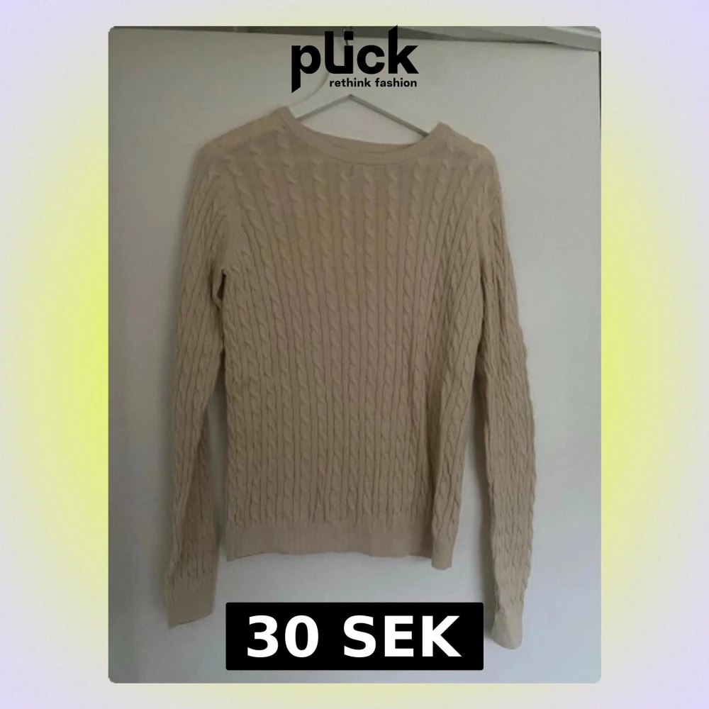 Kabelstickad tröja i beige med rund halsringning och långa ärmar. Tröjan har ett klassiskt flätmönster och ribbade muddar vid ärmslut och nederkant. Perfekt för lager på lager och enkel att matcha med olika stilar.