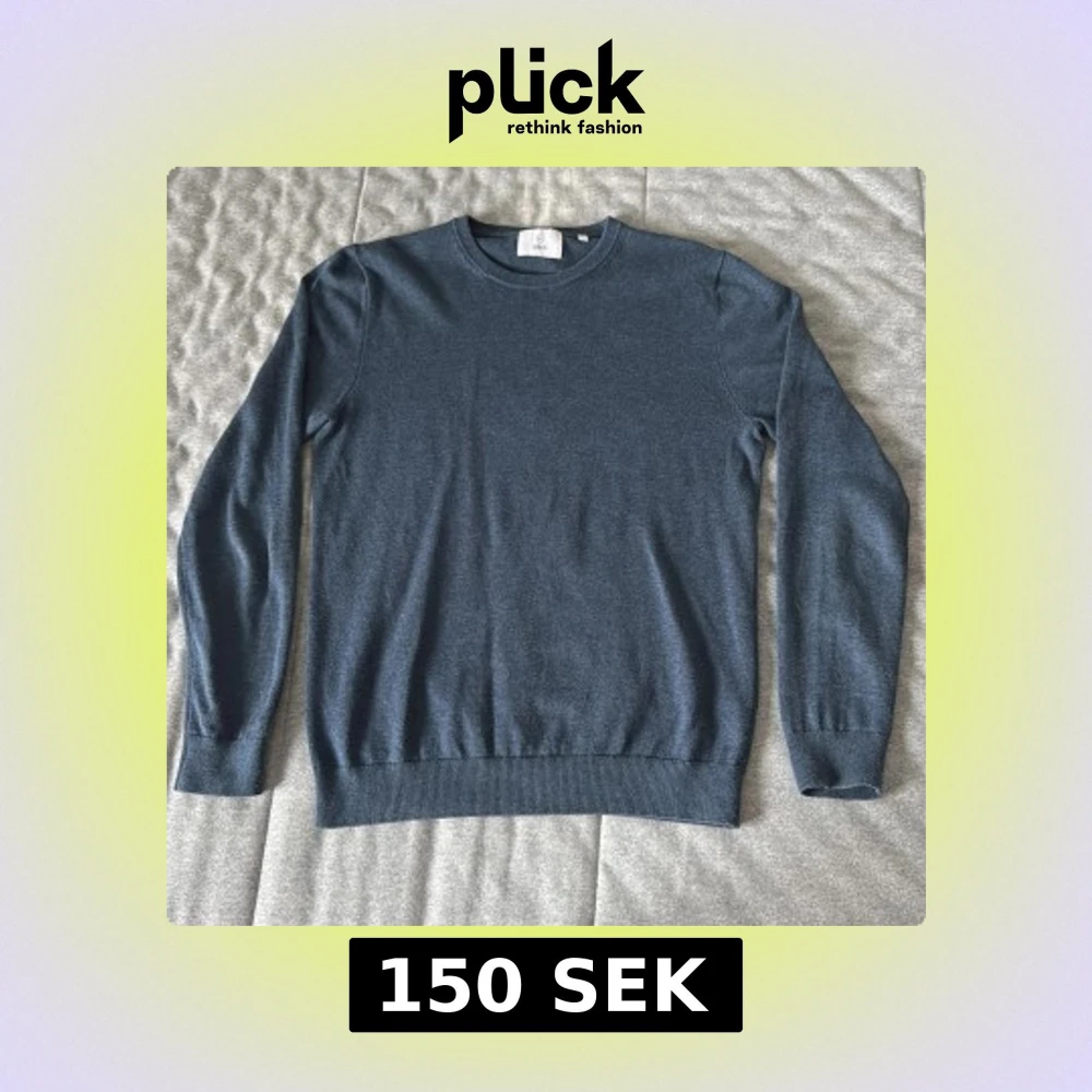 Mörkblå stickad tröja från Bläck i storlek S. Klassisk rund halsringning och ribbade muddar vid ärmslut och nederkant. Perfekt för lager-på-lager och enkel att matcha med jeans eller chinos.