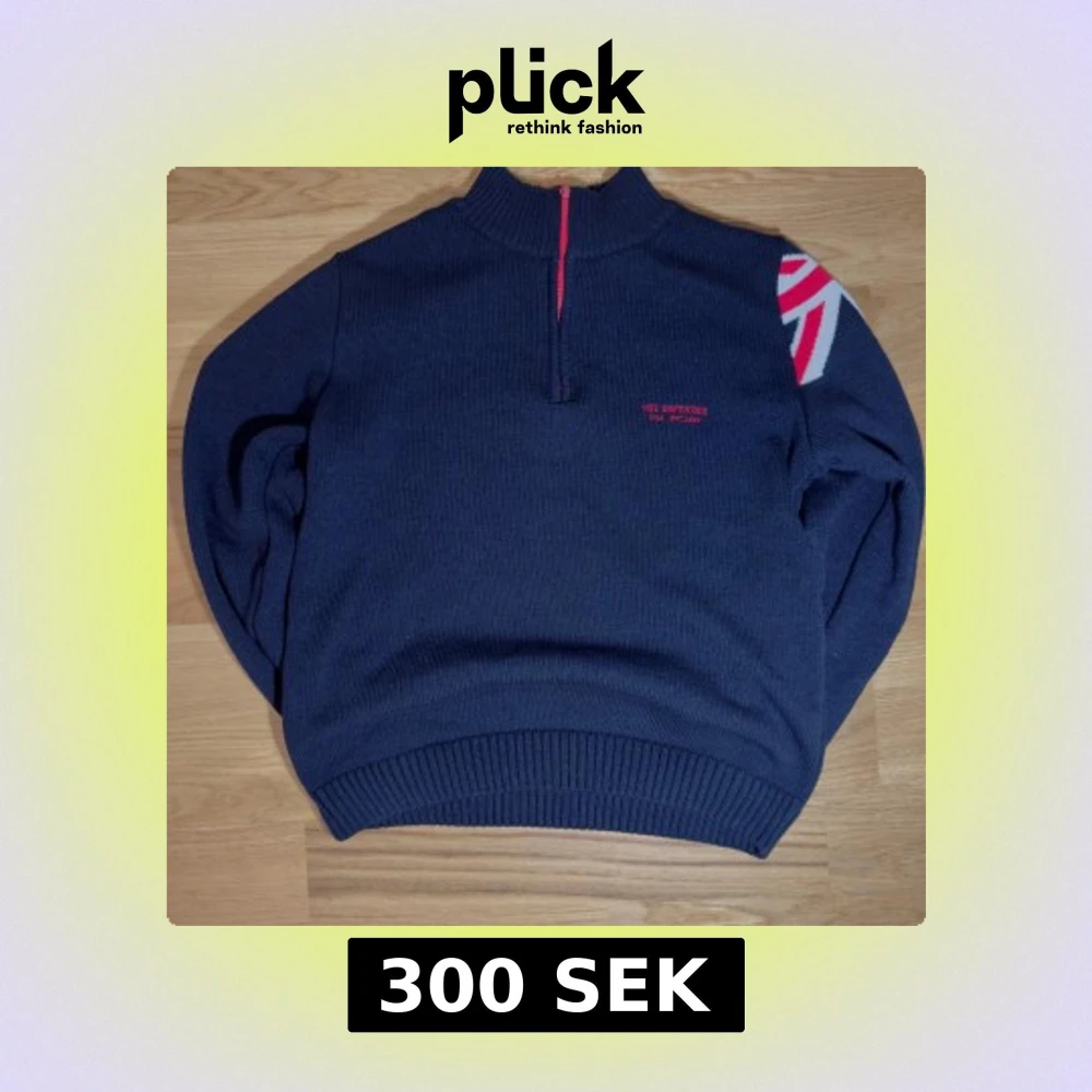 Säljer en mörkblå stickad tröja från The Defender med röd dragkedja och broderad logga. Tröjan har en hög krage med röd insida och ett mönster på axeln i rött och vitt. Perfekt för kyliga dagar!