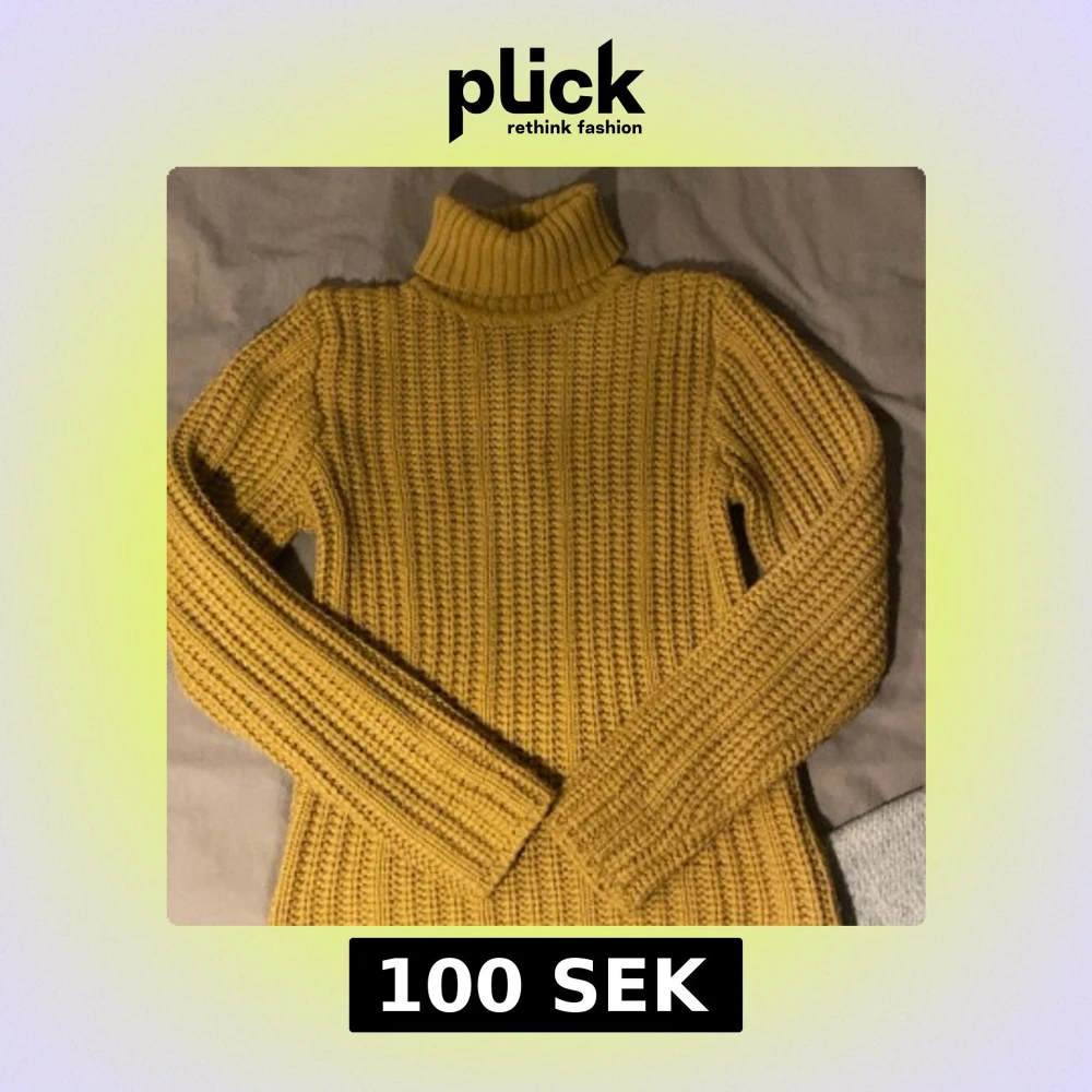 Säljer en mysig gul stickad polotröja med ribbad design. Perfekt för kyliga dagar med sin höga krage och långa ärmar. Ett måste för garderoben!