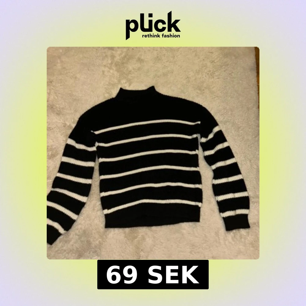 Snygg svart stickad tröja med vita horisontella ränder. Tröjan har lång ärm och en lite högre hals, perfekt för dig som gillar klassisk stil med en modern twist. Passar dig som vill ha en enkel men cool look.