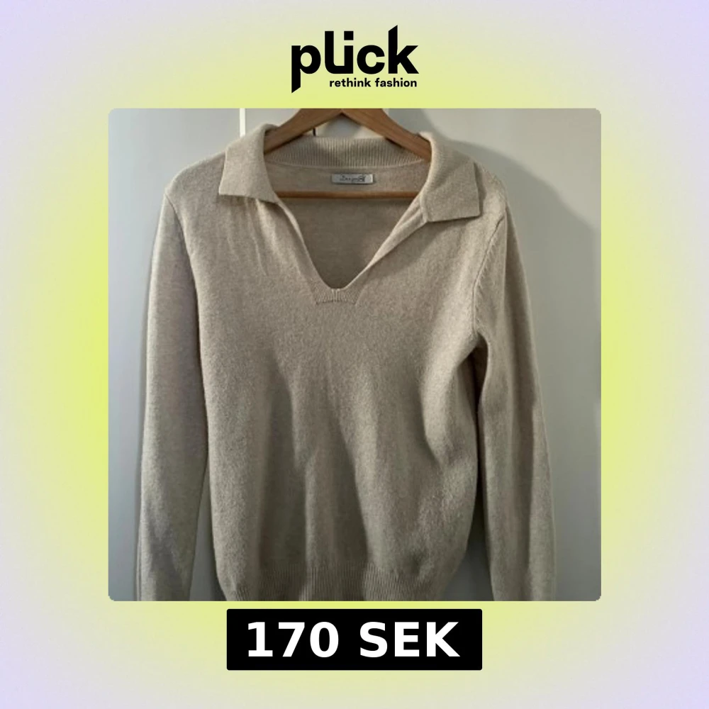 Snygg beige stickad tröja från Design by sí med klassisk krage och v-ringning. Tröjan har lång ärm och och sitter tajt i armar och lite lösare kring midjan!