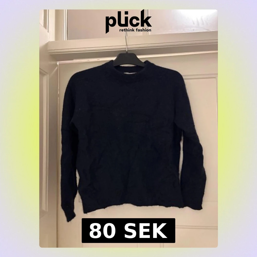 Säljer en enkel och snygg mörkblå stickad tröja med rund hals. Tröjan är från Zara och är långärmad och är gjord i ett mjukt stickat material som passar perfekt när det är lite kyligare ute. Skulle säga att den är mer som en xs i storleken