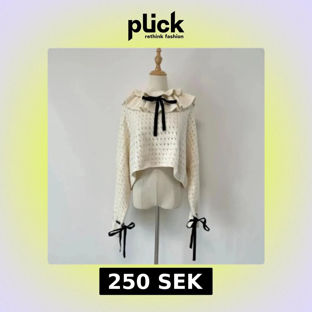 Supersöt vit stickad tröja med volangkrage och svarta rosetter vid halsen och ärmsluten. Storlek S. Nyskick. Kom gärna med prisförslag