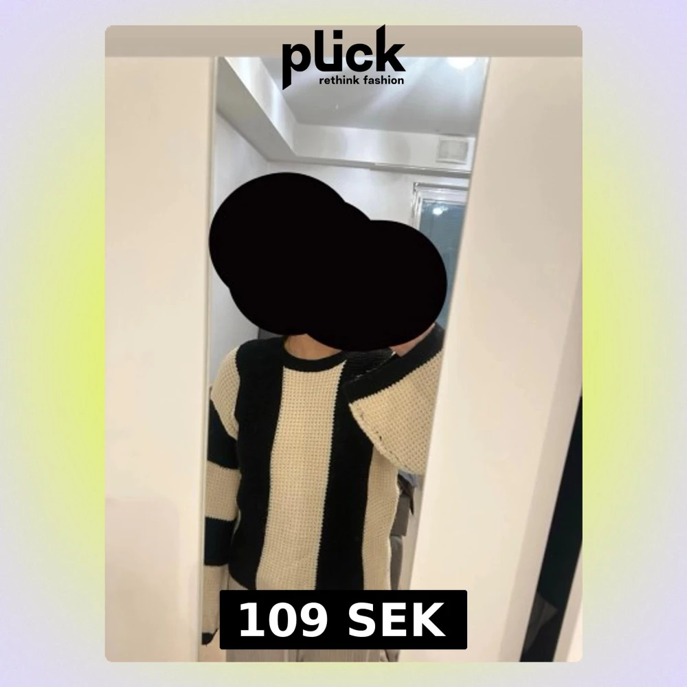 Säljer en stickad tröja med breda svarta och vita vertikala ränder. Tröjan har rund halsringning och långa ärmar. Materialet ser ut att vara mjukt och grovstickat, perfekt för en avslappnad och trendig look.