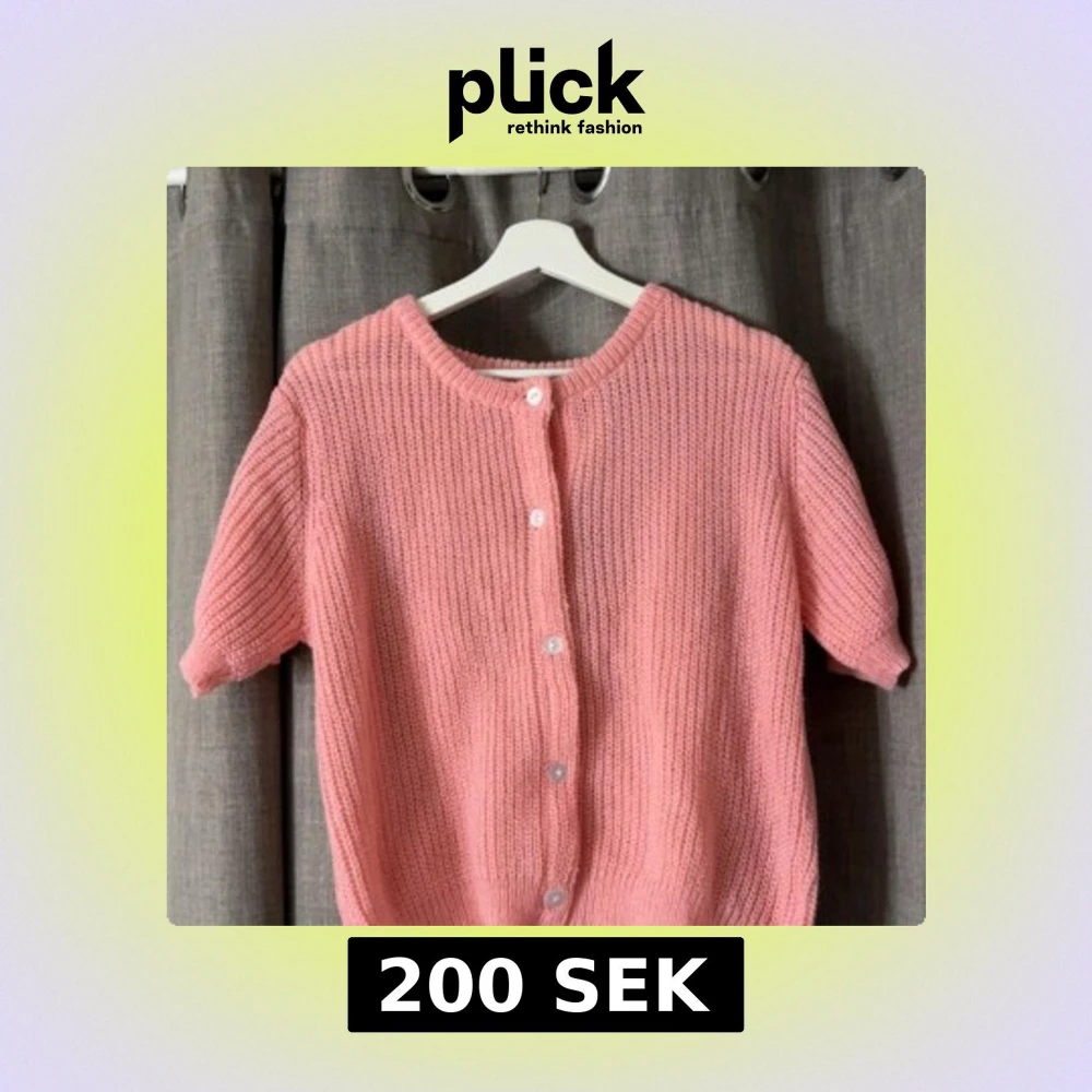 Superfin rosa stickad kofta med korta ärmar och rund hals. Koftan har en ribbad struktur och knäpps framtill med vita knappar.