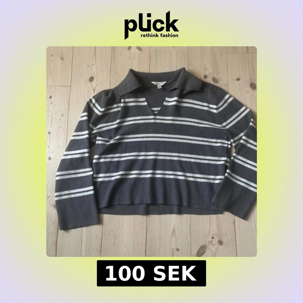 Grå tröja från Aware med vita horisontella ränder. Tröjan har en krage, v-ringning och långa ärmar. Har även slits på båda sidorna, strl s och bra passform. Sparsamt använt och ser ny ut.
