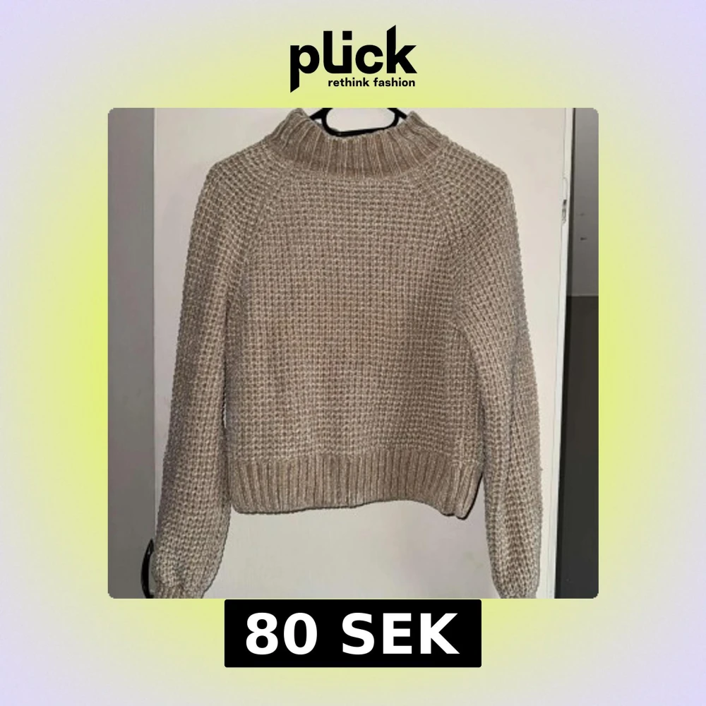 Säljer en mysig beige stickad tröja med grovstickat mönster.