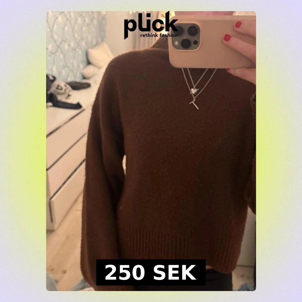 Mysig brun stickad tröja med hög hals och ribbade muddar vid ärmslut och nederkant. Tröjan har en loose passform och är lite croppad, perfekt att styla med höga jeans. Materialet känns mjukt och värmande, idealisk för kyliga dagar.