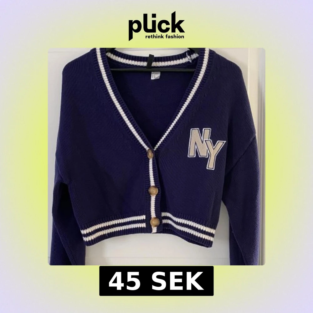 Snygg marinblå croppad kofta med vita ränder och broderad NY-logga på bröstet. Koftan har v-ringning, långa ärmar och tre träknappar framtill. Stickad i mjukt material och har ribbade detaljer vid krage och nederkant.