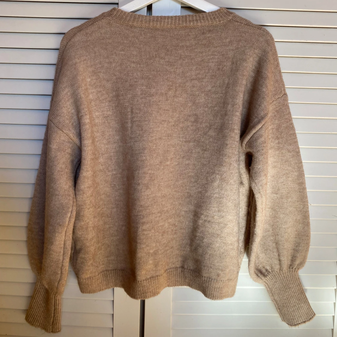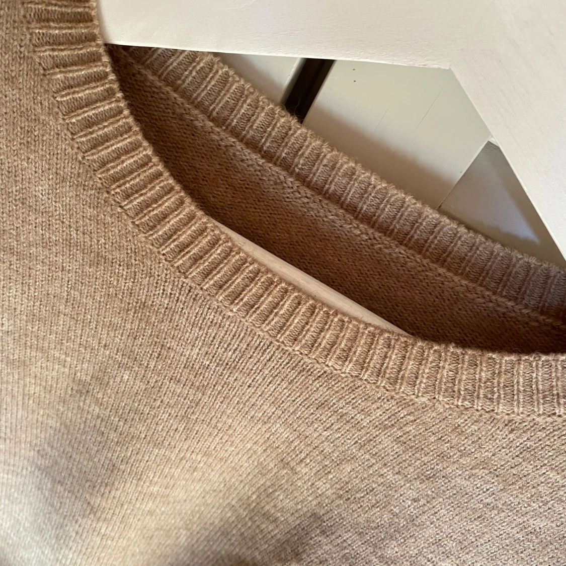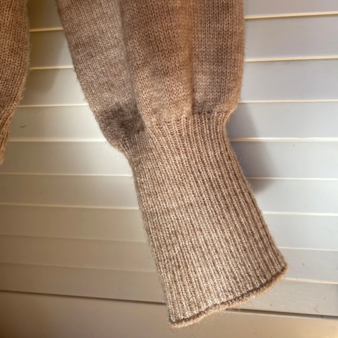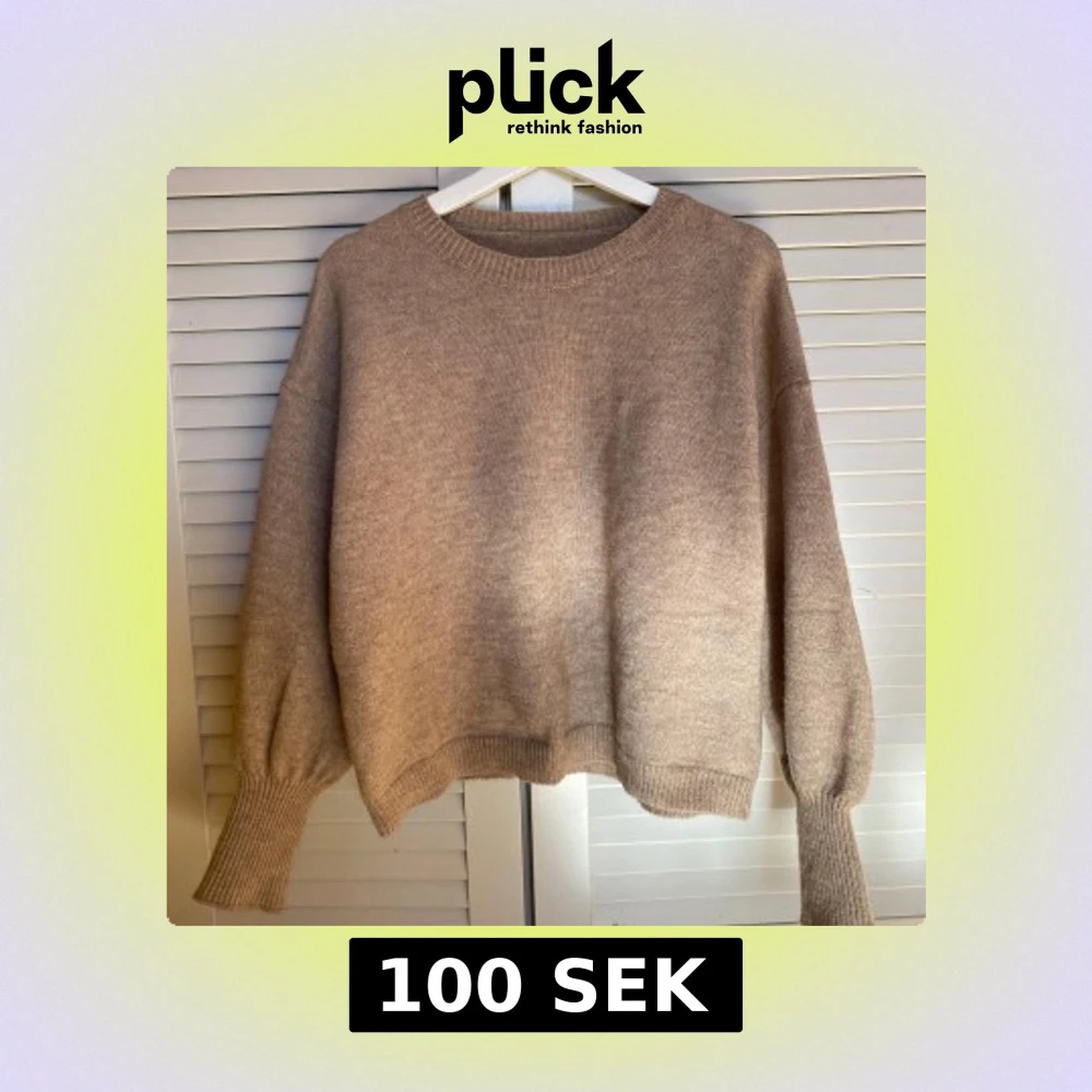 Säljer en mysig beige stickad tröja med rund hals och långa ärmar. Tröjan har ribbade muddar vid ärmslut och nederkant, vilket ger en stilren look. Perfekt för kyligare dagar!