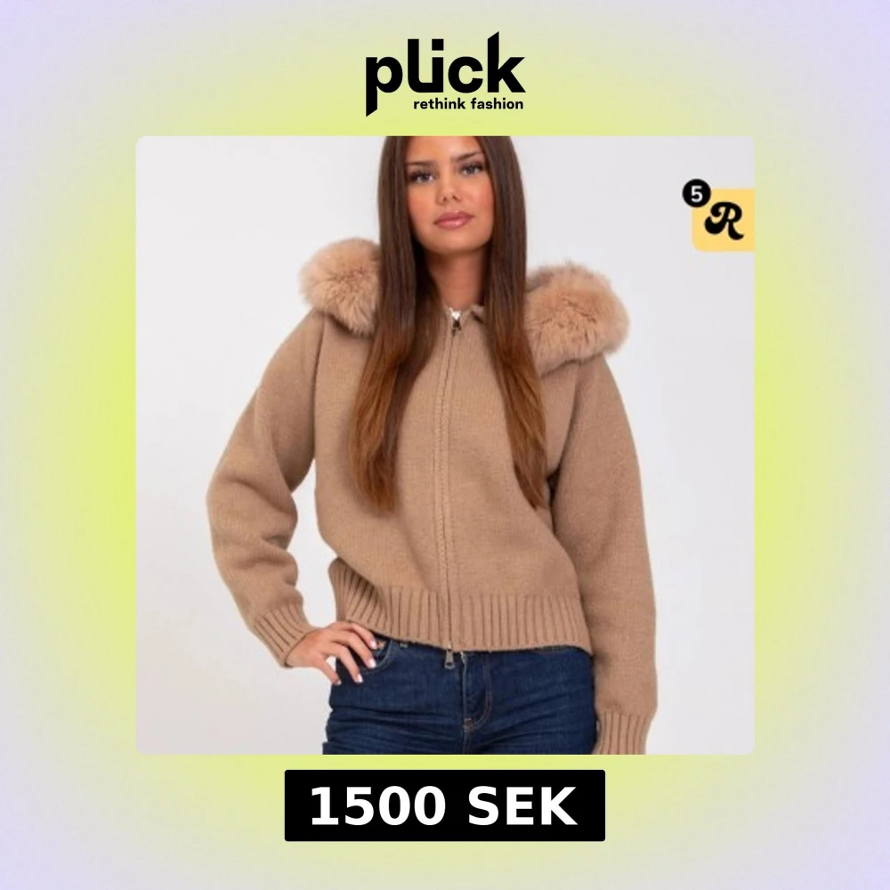 Snygg beige stickad jacka med dragkedja och en lyxig pälskrage. Jackan har långa ärmar och ribbade muddar vid ärmslut och nederkant. Perfekt för kyligare dagar. Använd en gång. Nypris 1800kr Mitt pris 1500
