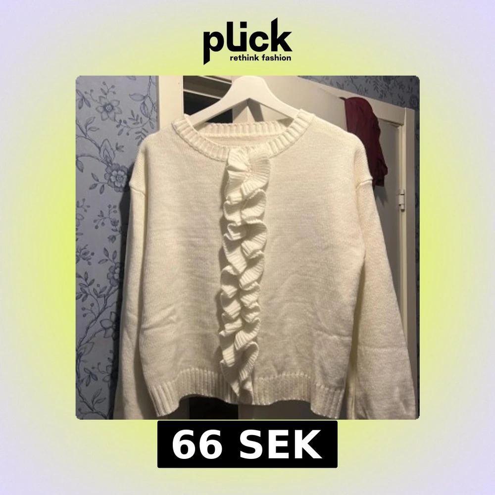 Supersöt vit stickad tröja med lång ärm och bred volang framtill som ger en extra touch. Rund halsringning och ribbade muddar vid ärmslut och nederkant. Perfekt för dig som gillar en clean look med lite extra detalj.