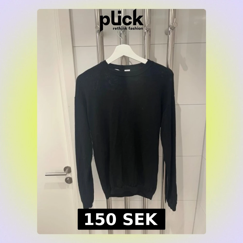 En enkel svart stickad tröja med rund hals och långa ärmar. Tröjan har en klassisk passform och ribbade muddar vid hals, ärmslut och nederkant. Perfekt att slänga på sig när det är lite kyligt ute. Storlek s 100% merinoull liten defekt se bild 3