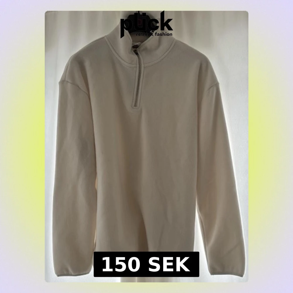 Mysig vit fleece-tröja med hög krage och halv dragkedja framtill. Tröjan har en avslappnad passform och långa ärmar, perfekt för lager-på-lager. Materialet är mjukt och värmande, vilket gör den skön att bära under kyliga dagar.