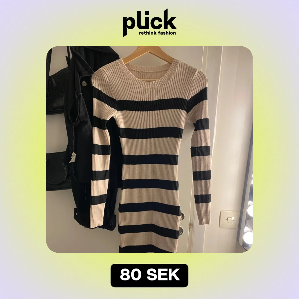 Säljer en superfin randig stickad klänning i beige och svart. Den är långärmad och har en tight passform som verkligen framhäver figuren. Perfekt för höst och vinter, och den är både bekväm och stilren. Passar lika bra till vardags som till festligare tillfällen! Klänning är helt ny och aldrig använts 💞💞
