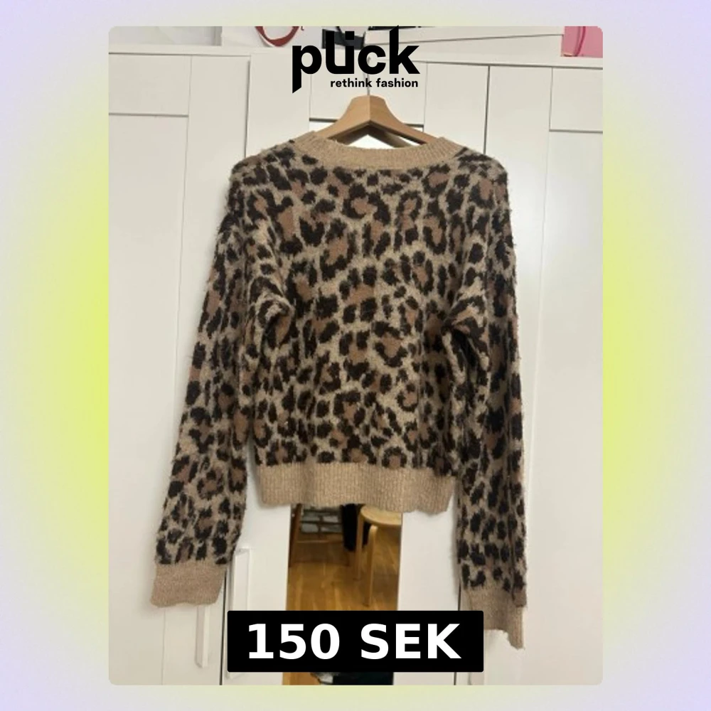 Säljer en fluffig stickad tröja med leopardmönster i beige, brunt och svart. Tröjan har långa ärmar, ribbade muddar och en avslappnad passform. Perfekt för dig som vill ha en trendig och mysig look.
