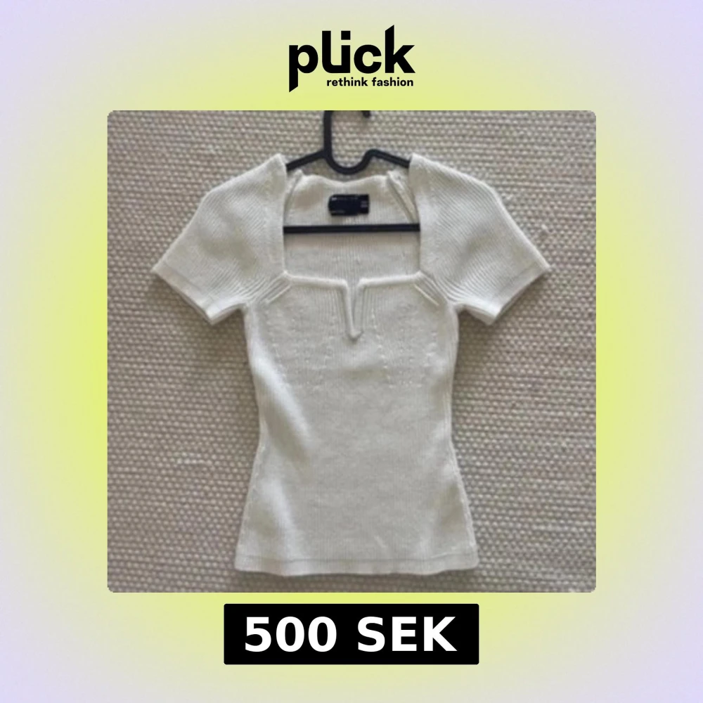 Säljer en vit stickad topp med korta ärmar och snygg v-ringad hals med unik kant. Modellen är slim och sitter tajt mot kroppen. Perfekt för dig som gillar stilrena och trendiga plagg med lite edge.d n har en liten blå fläck på sig som inte försvinner