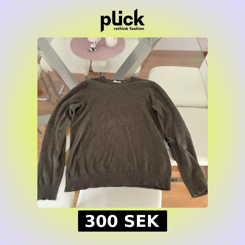 En enkel och stilren mörkgrön stickad tröja med rund halsringning och långa ärmar. Tröjan har ribbade muddar vid ärmslut och nederkant, perfekt för lager-på-lager under kyliga dagar. Säljer pga för liten. Mycket bra skick.