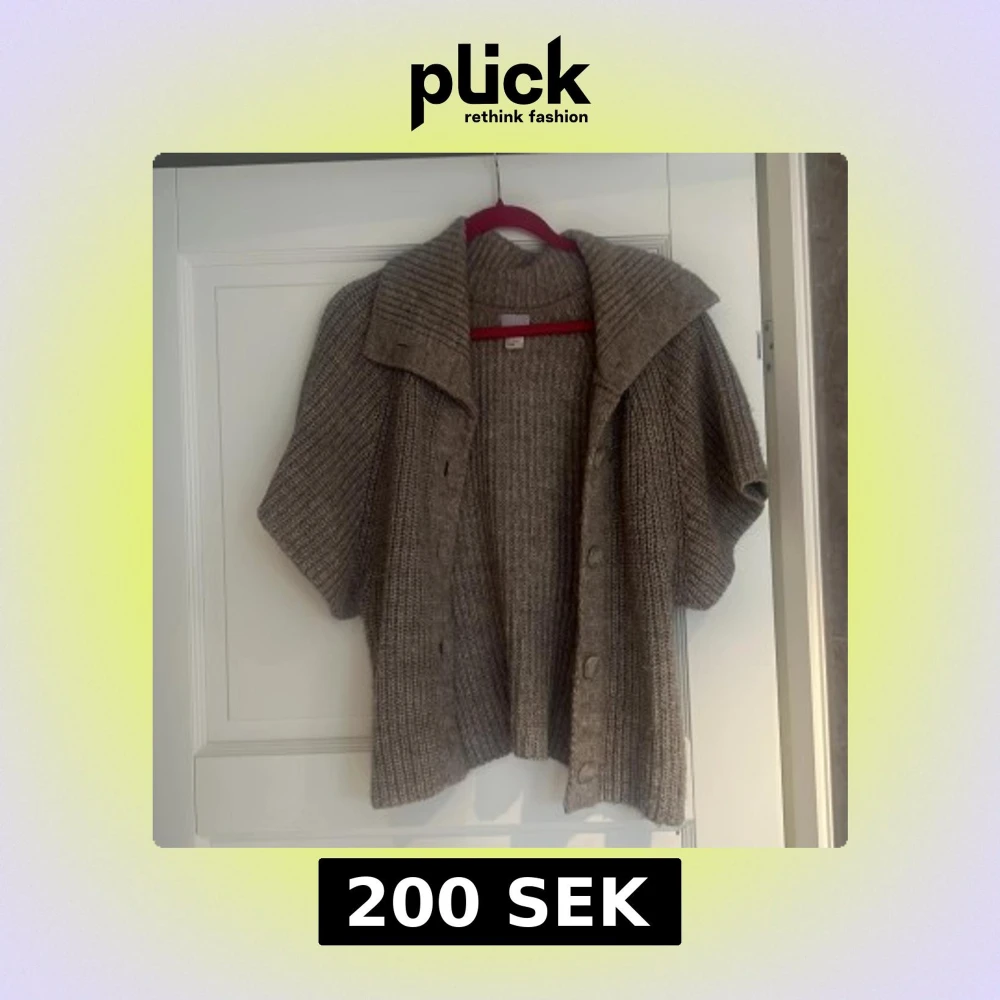 Mysig beige stickad kofta med korta ärmar och bred krage. Koftan har grov ribbstickning och knappar framtill, perfekt för lager-på-lager. Avslappnad passform och mjukt material som känns skönt mot huden.