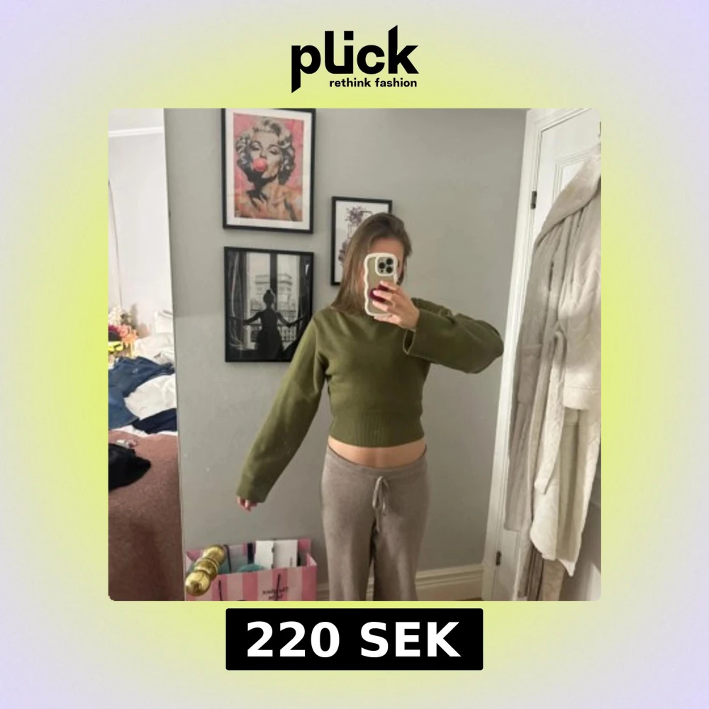 Säljer en olivgrön croppad stickad tröja med bred ribbad mudd i midjan och vid ärmslut. Tröjan har lång ärm och en klassisk rund halsringning. Perfekt för lager-på-lager och snygg till både jeans och kjol.