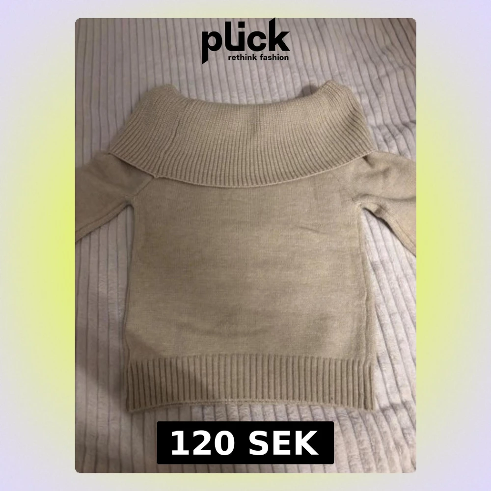 En beige stickad tröja med off shoulder-krage och långa ärmar. Tröjan har ribbstickade muddar vid ärmslut och nederkant, vilket ger en snygg och bekväm passform. Perfekt för dig som gillar en stilren och trendig look. Ärmarna är lite utsvängda. Aldrig använd eftersom den inte passade så bra.