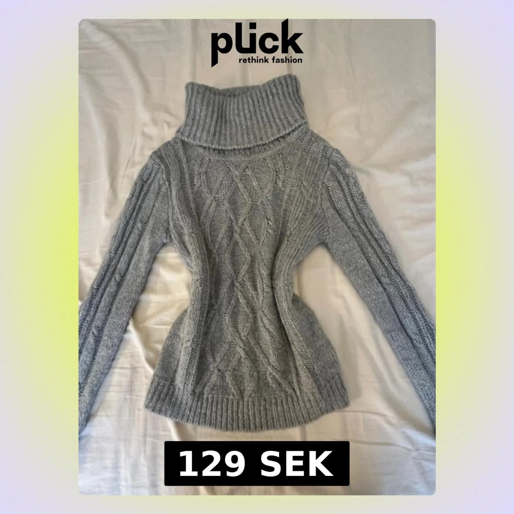 Snygg grå stickad polotröja med kabelstickat mönster framtill och ribbade muddar. Tröjan har lång ärm och hög, bred polokrage som ger en cool och mysig look. Perfekt för kalla dagar och enkel att matcha med jeans eller kjol.