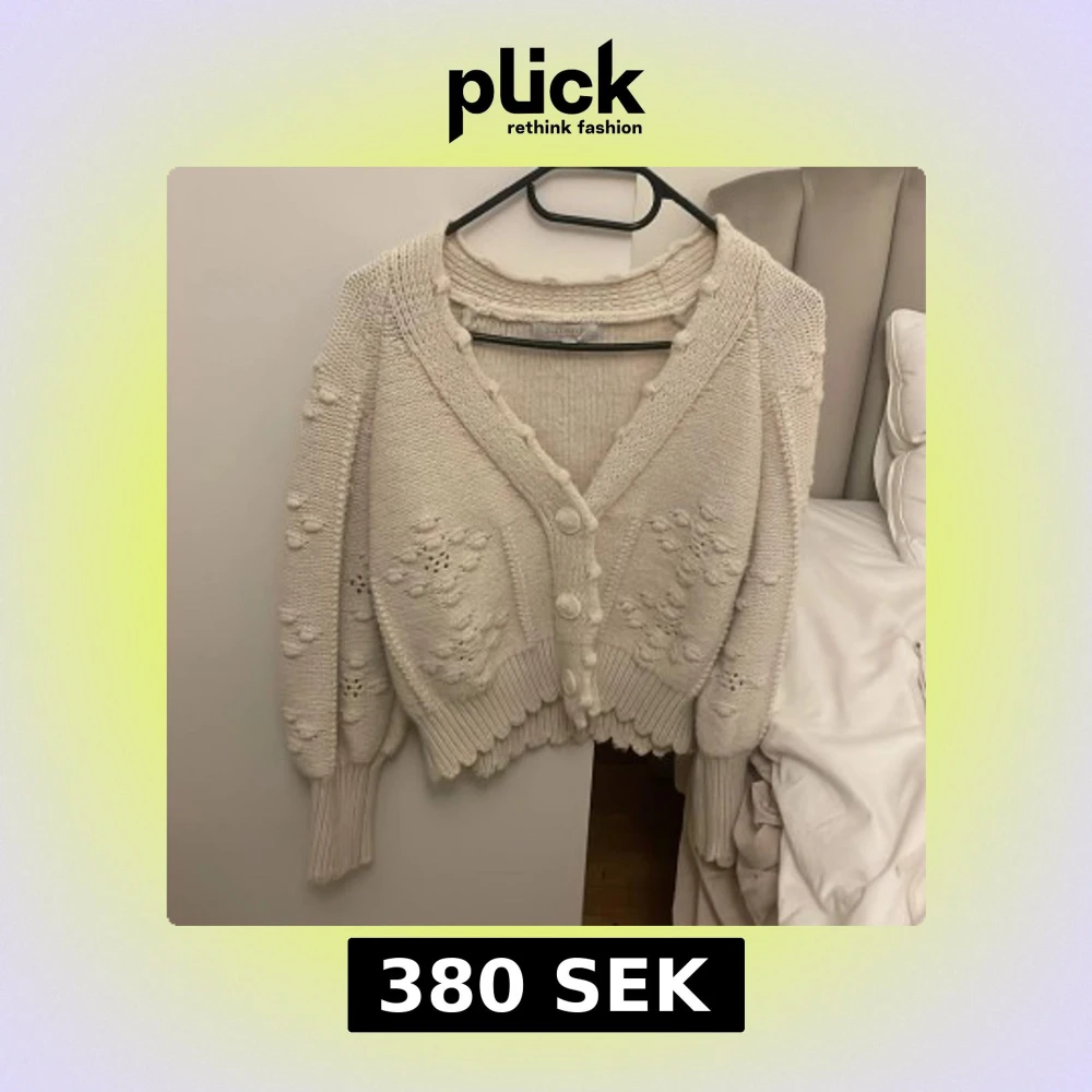 Supermysig beige stickad kofta från Effenty med stora knappar framtill, ballongärmar och fina virkade detaljer. Koftan har ribbade muddar och en lite oversized passform, perfekt för lager på lager under kyliga dagar. Jag skulle säga att den är i storlek S och passar även i XS.