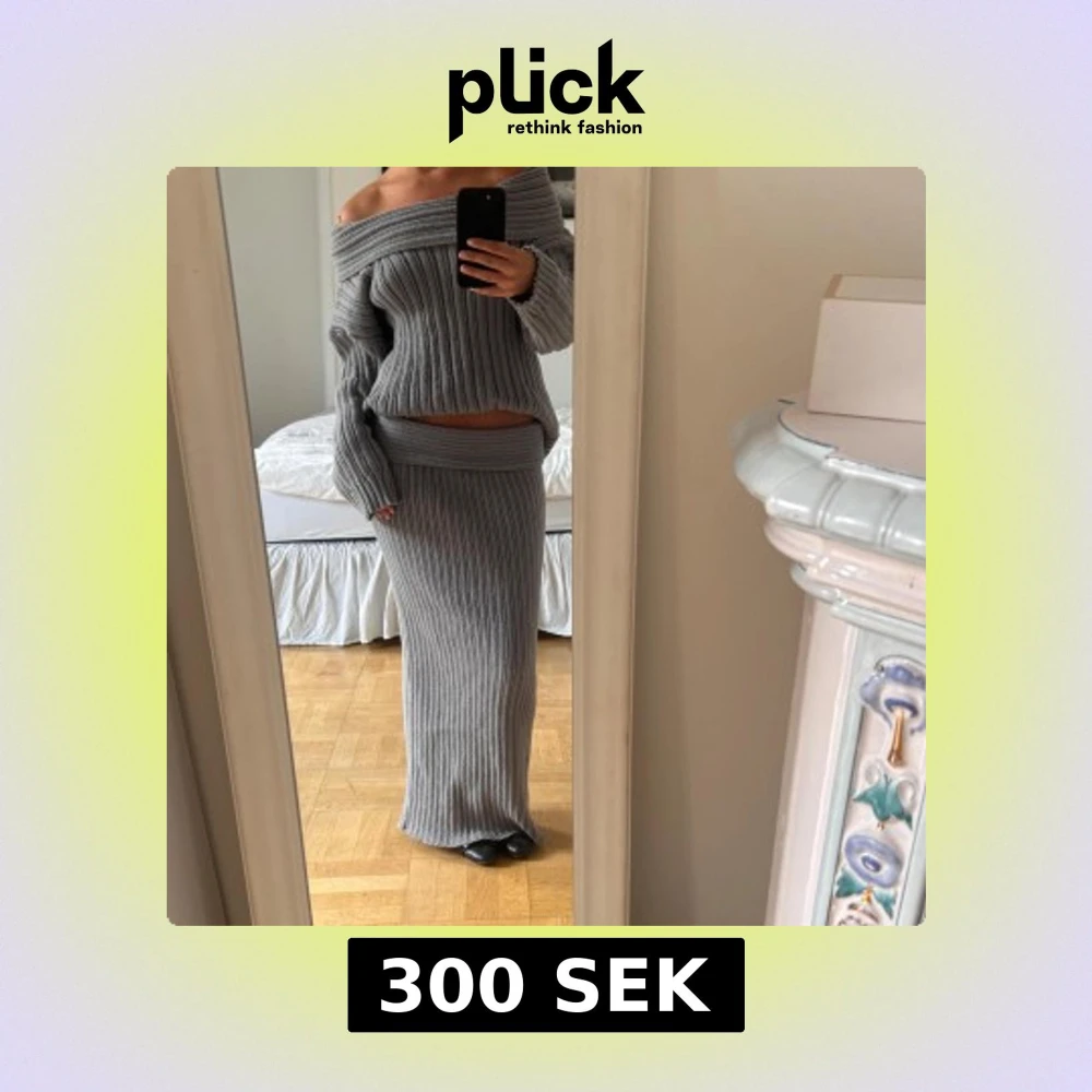 Säljer ett snyggt grått sätt i ribbstickat material. Kjolen är lågmidoch har en rak, figurnära passform som ger en clean och modern look. Perfekt att styla med den matchande stickade tröjan för en chill vibe men även uppklätt.