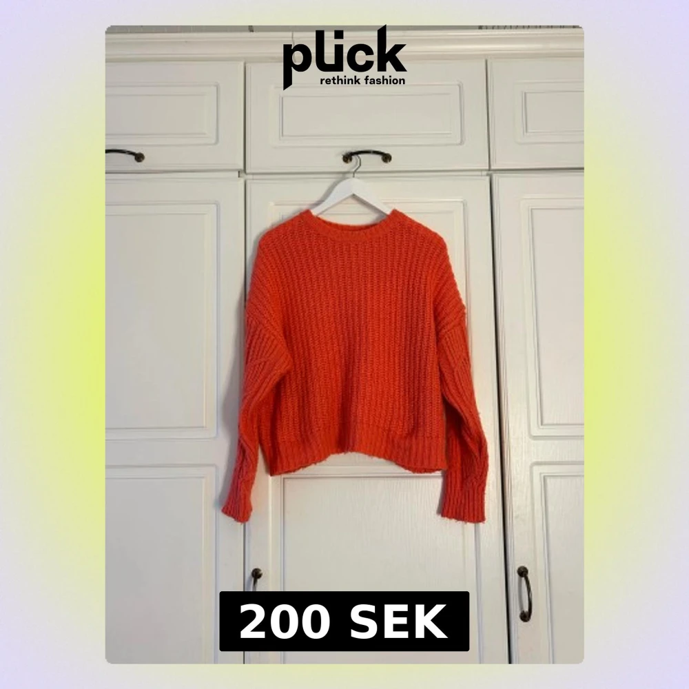 Säljer en snygg stickad tröja i en stark orange färg. Tröjan har en loose passform, grovstickad struktur och långa ärmar med ribbade muddar. Perfekt för dig som gillar färg och vill ha en chill vibe på din outfit.