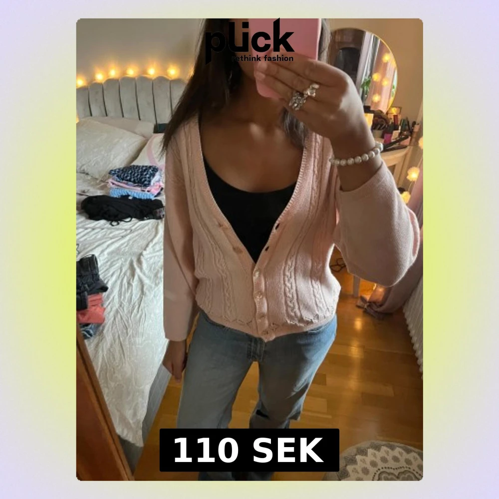 Superfin ljusrosa stickad kofta med snygga kabelstickade detaljer och pärlemorknappar framtill. Koftan har v-ringad hals och långärmade, lite loose ärmar.