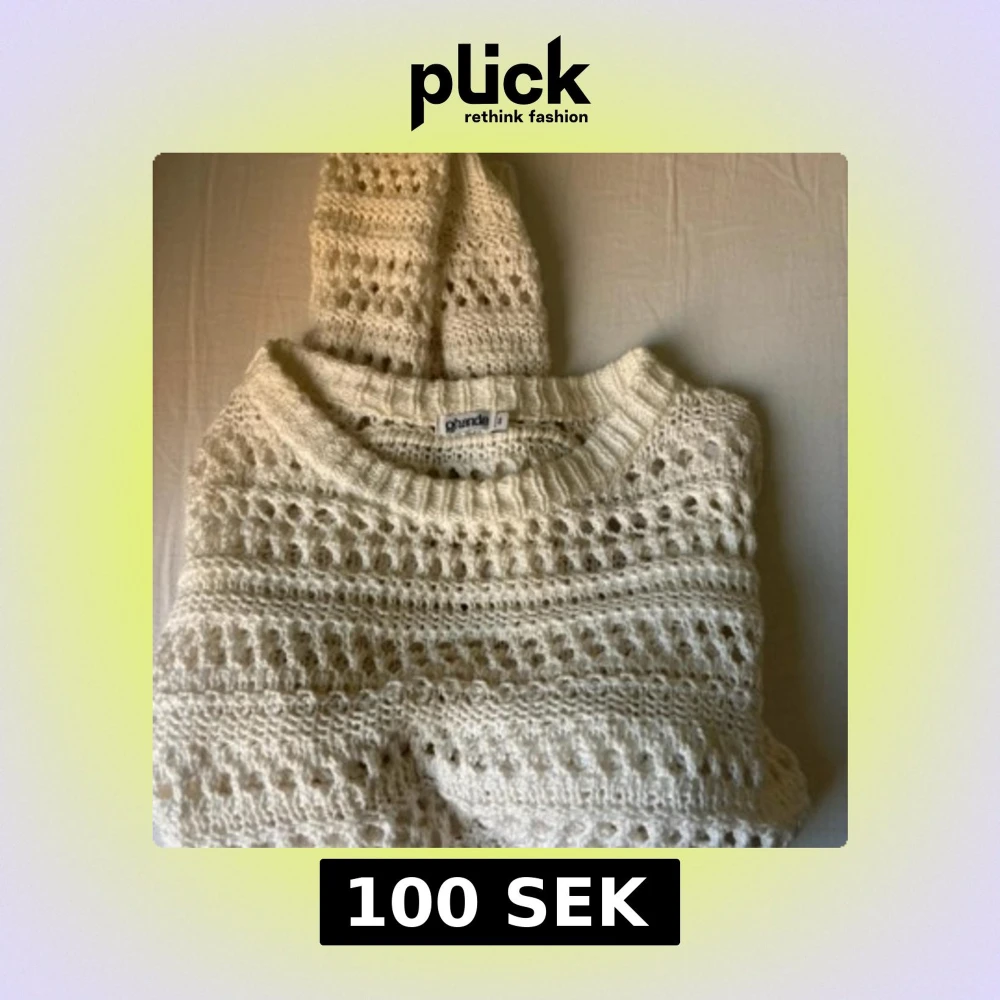 Säljer en vit stickad tröja från Gharanda i storlek S. Tröjan är croppad med lång ärm och har ett snyggt hålmönster som ger en chill vibe. Perfekt att slänga på över ett linne eller bikini. Rund hals och mjukt material. 100% bomull