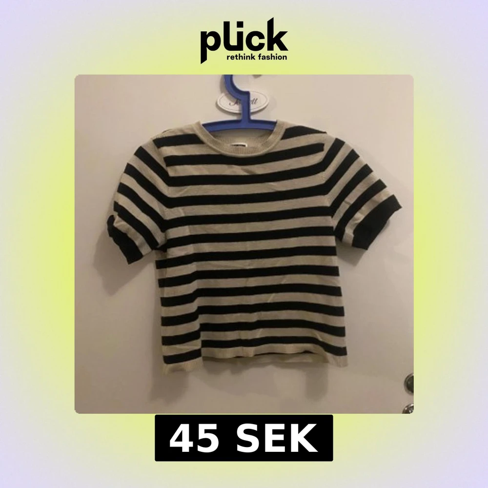 Säljer en kortärmad stickad tröja med breda svarta och vita ränder. Tröjan har rund hals och ribbade kanter vid ärmslut och nederkant. Perfekt för dig som gillar klassisk stil med en twist. Passar både till jeans och kjol.