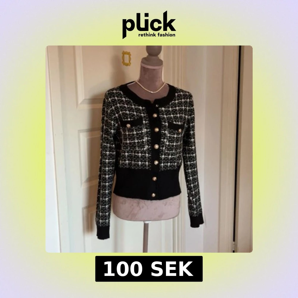 Snygg svartvit rutig kofta med guldiga knappar framtill och på fickorna. Koftan har lång ärm, ribbade muddar och en croppad passform. Perfekt för dig som gillar en chic och trendig look. Materialet känns mjukt och stickat.