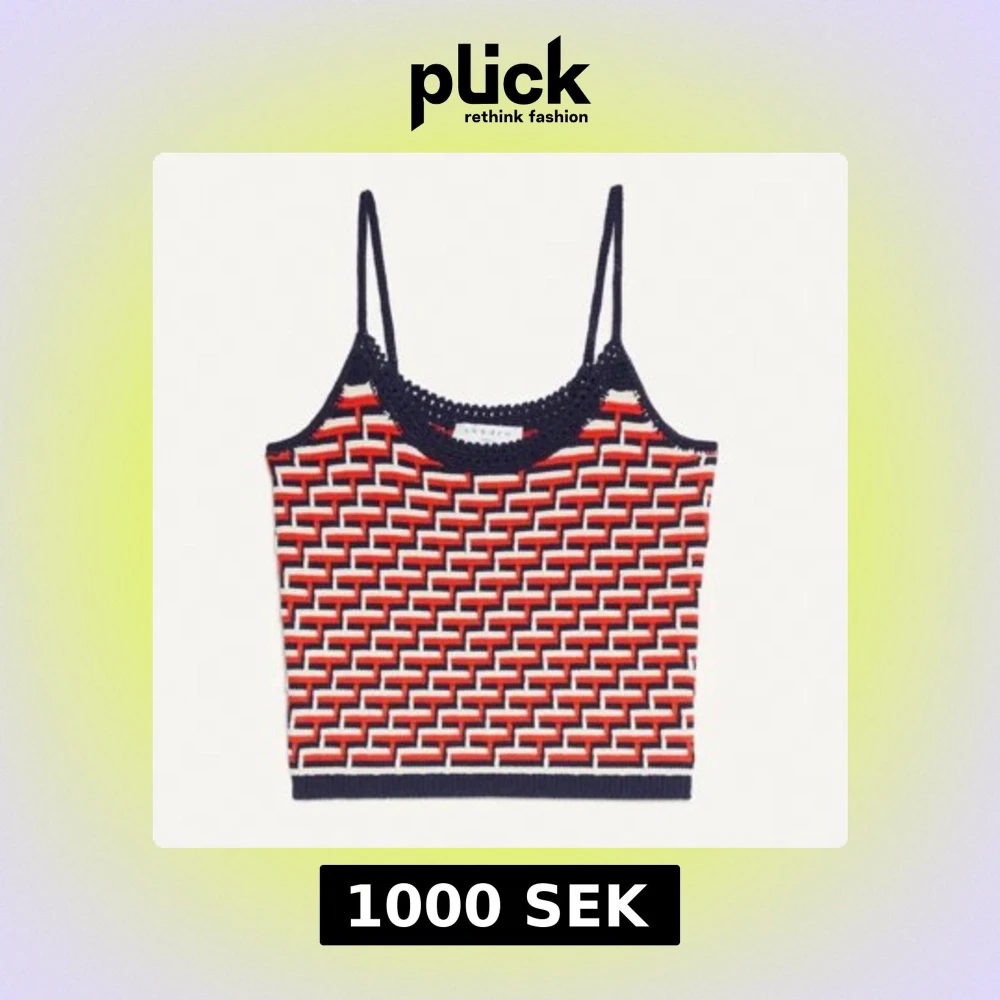 Säljer en stickad linnetopp från Sandro med smala axelband. Toppen har ett mönster i rött, vitt och marinblått och är perfekt för sommaren. Snygg och unik design med virkade detaljer vid halsringningen. Storlek 2 i Sandros storlek. Använd 1 gång.
