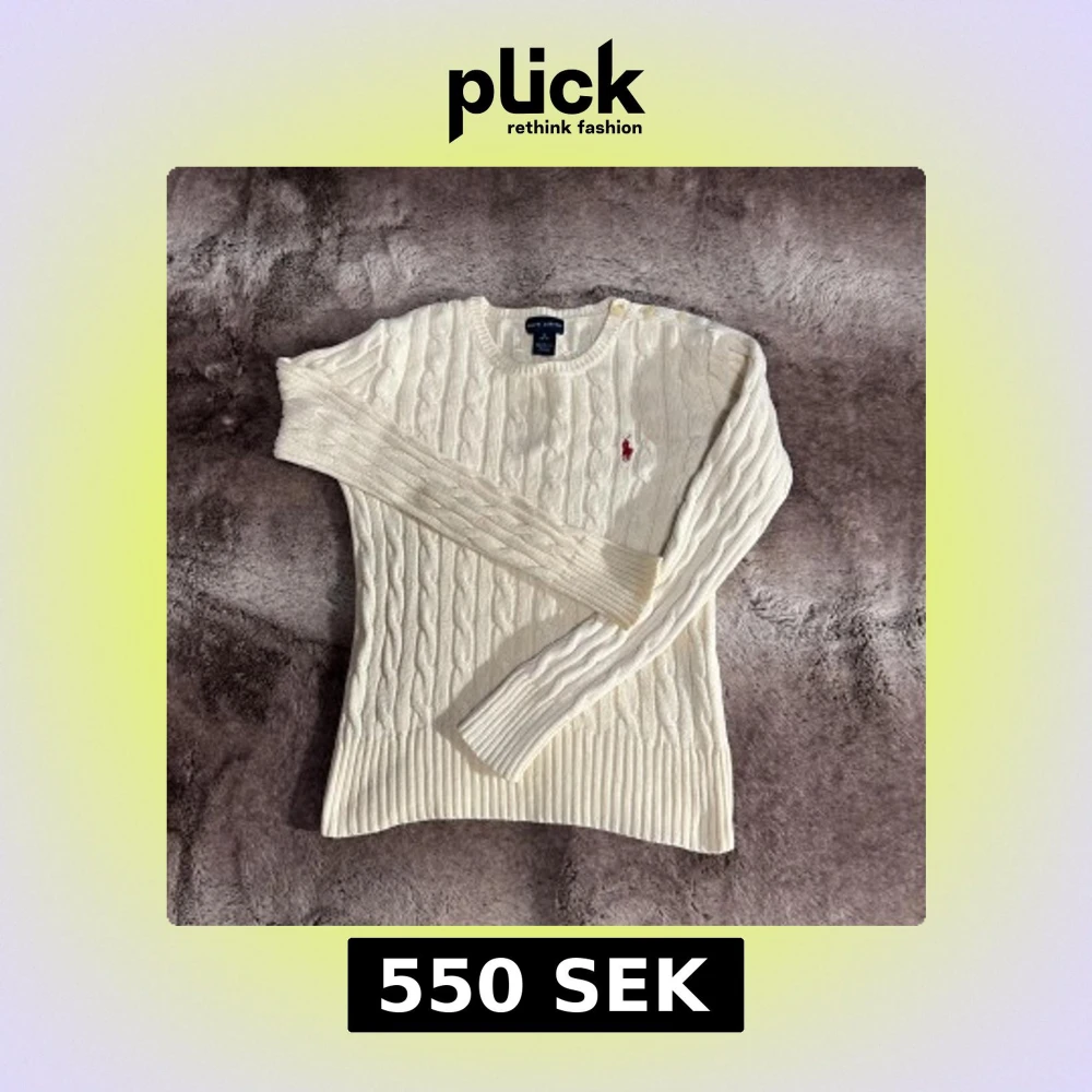 Säljer en stilren vit stickad tröja från Ralph Lauren med kabelstickat mönster och en broderad röd logotyp på bröstet. Tröjan har långa ärmar och rund halsringning. Perfekt för kyligare dagar!