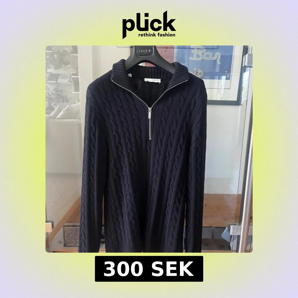 Svart kabelstickad tröja från Selected Homme med halv dragkedja och hög krage. Tröjan har lång ärm och ribbade muddar, perfekt för lager-på-lager under kyliga dagar. Klassisk och stilren look som funkar till det mesta.