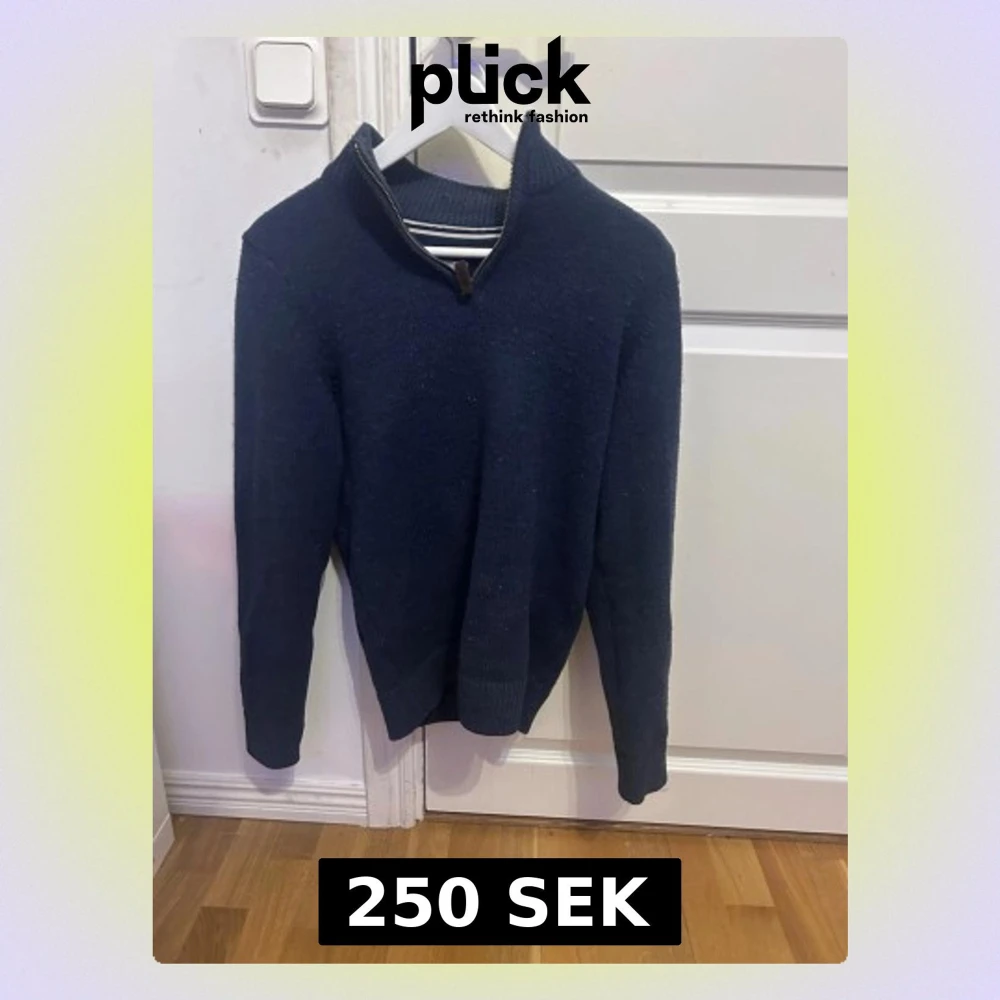 Mörkblå stickad tröja med halv dragkedja i halsen och ribbade muddar. Tröjan har en klassisk passform och är perfekt för lager-på-lager. Materialet är mjukt och värmande, perfekt för att ha under vinterjacka och gå runt i bara den i sommar/vår.