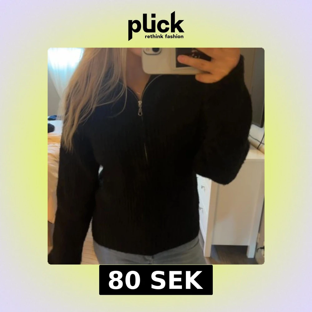 Mysig svart stickad tröja med ribbad struktur och half zip-dragkedja framtill. Långärmad modell med lite loose fit, perfekt för kyliga dagar. Enkel att matcha med jeans eller kjol för en chill look.