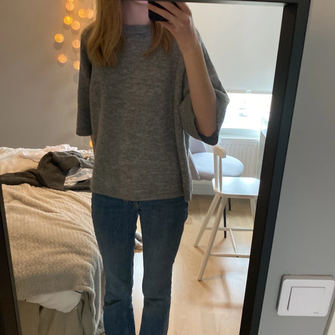 En grå stickad trekvartsärmad tröja från lager 157 som är slutsåld i storlek XS, använd 1 gång. Köpte för 150 kr