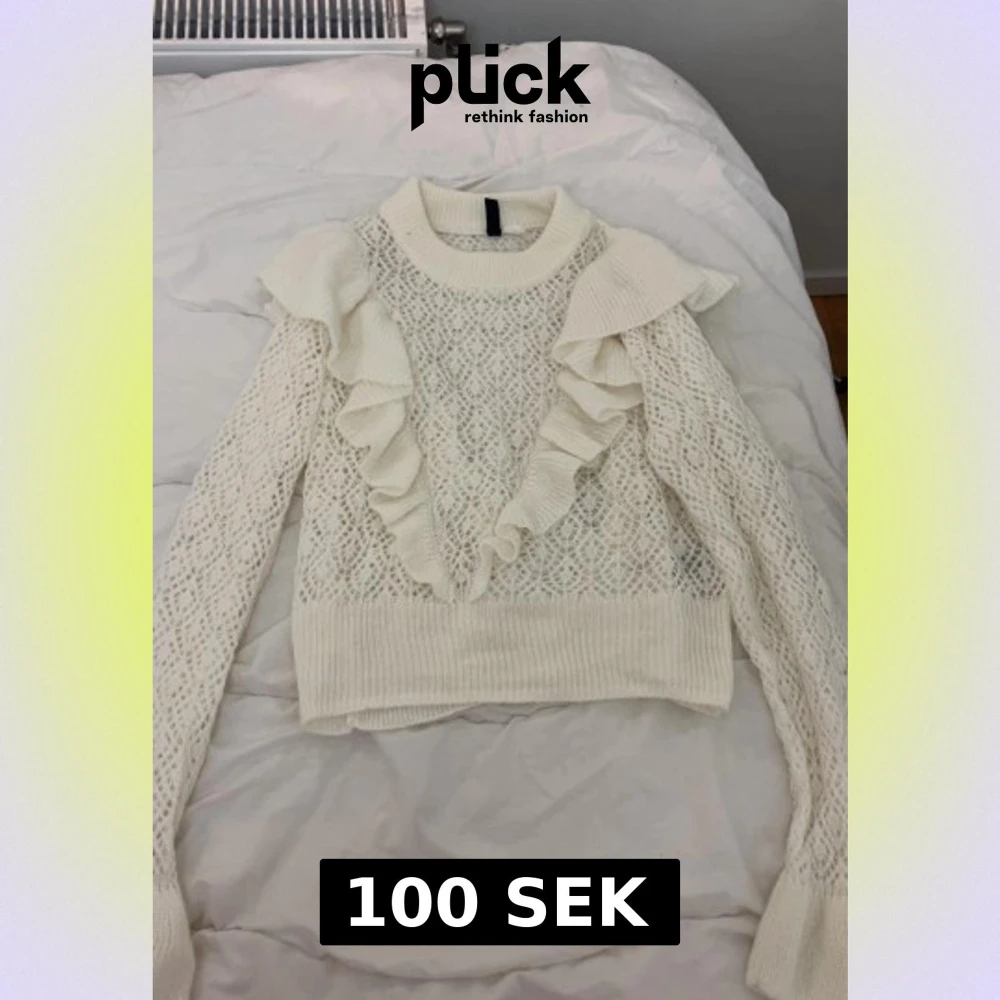 Supersöt vit stickad tröja från H&M med snygga volangdetaljer på axlar och framstycke. Tröjan har ett stickat genombrutet mönster. Oanvänd!