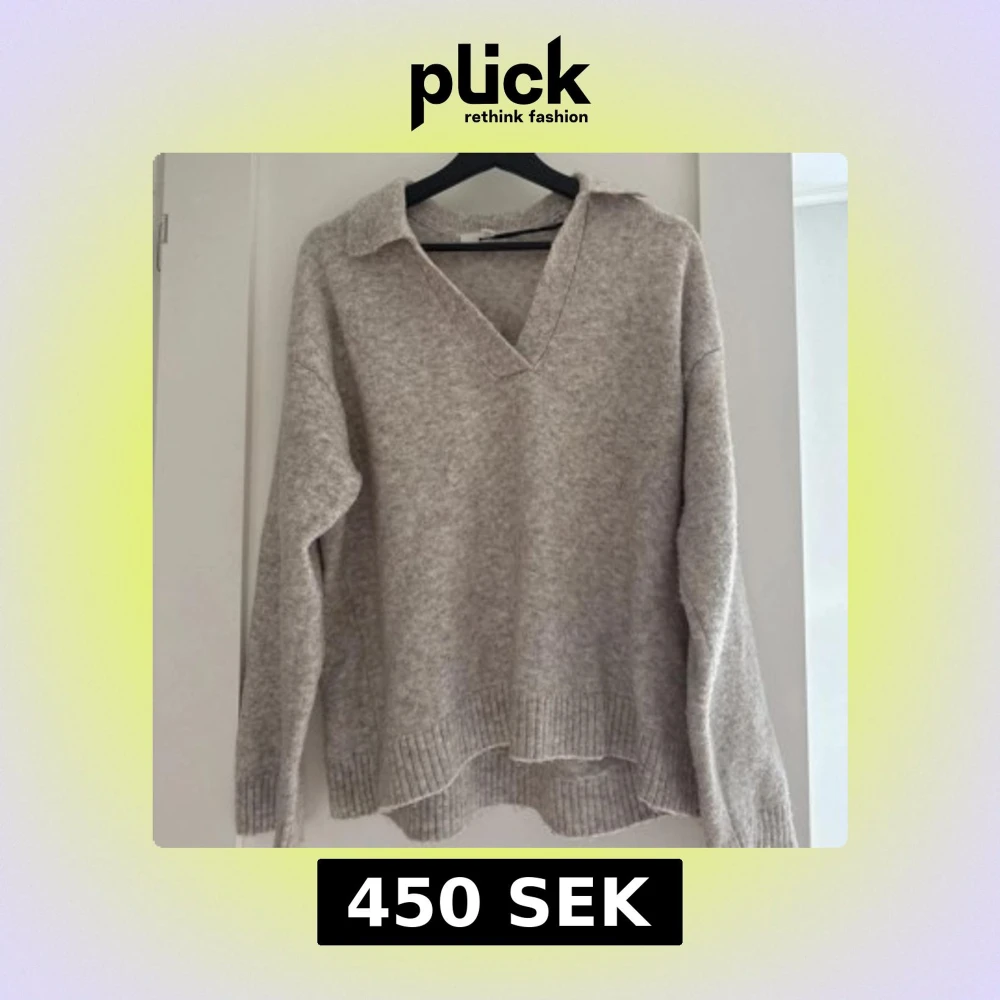 Mysig beige stickad tröja från H&M med v-ringad hals och krage. Tröjan har långärmade ärmar och ribbade muddar vid ärmslut och nederkant. Perfekt för lager-på-lager och chill stil under höst och vinter.